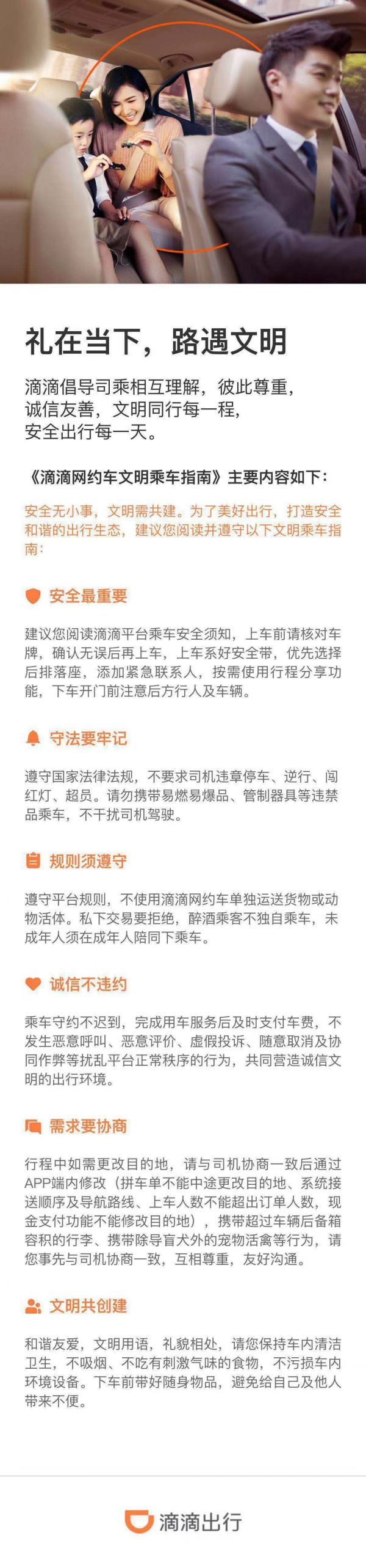 网易科技讯9月11日消息,滴滴出行平台规则官方微博今日正式发布《滴滴网约车文明乘车指南》,该指南是在此前公布的征求意见稿基础上,结合公众意见最终修订的版本,适用于滴滴出行平台内的快车、优享、专车和豪华车等网约车服务。