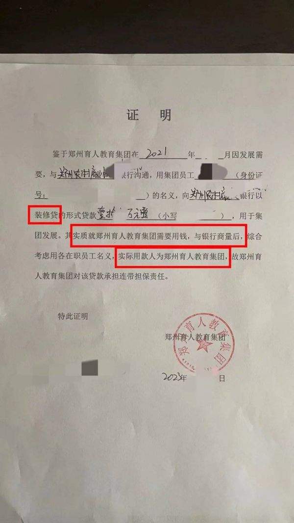 此外,这名员工称,后来贷款经理坚称当时有讲解贷款风险,“我记得合同上有写是个人装修贷,我问这是什么意思,当时学校的人就说这只是走个流程,已经和银行协商好了,只是让你们签个字,走一下流程,说实际上是集团的贷款。当时学校说这个话的时候,银行的工作人员在场,也没有否认。”