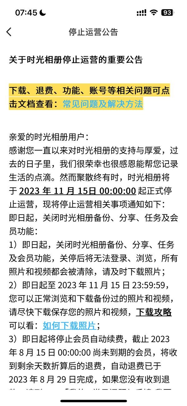 今年 8 月 15 日,时光相册宣布将于 11 月 15 日 00:00:00 起正式停止运营,包括关闭时光相册备份、分享、任务及会员功能,关停后将无法登录、浏览,所有照片和视频都会被清除,请及时下载照片。