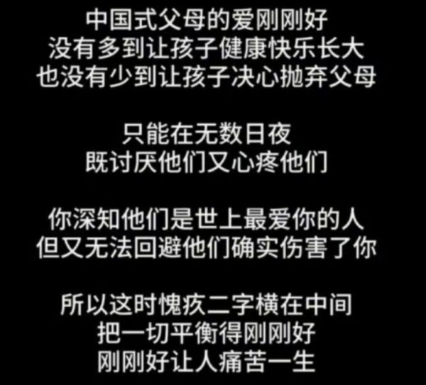 在这一声讨背后,是对被父母扫兴的童年的感伤,是对拧巴的中国式亲子关系的无可奈何,更是代际冲突在个体身上造成精神内耗痛苦的外显。