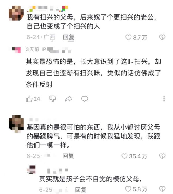 在这英讲述自己被父母扫兴经历的播客评论区中,网友们也分享了诸如此类的经历。