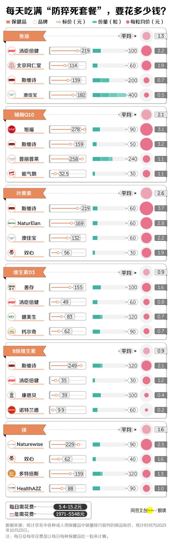 我们梳理了某电商平台销量排行前列的保健品价格,发现如果要每天吃这一套防猝死套餐,口袋里还是需要有点资本的。