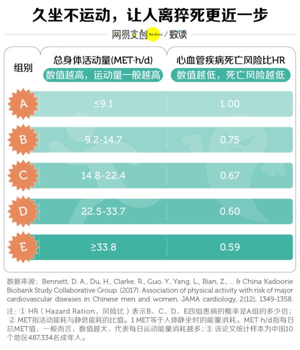 以运动为例,一项以 48.7 万名中国成年人为样本的研究表明,总身体活动量越小,患心血管疾病的死亡风险比一般就越高 [12]。