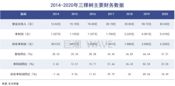 纵观三棵树目前公布的业绩报告。从2014年以来,三棵树不论从营收还是净利润来说,都呈现出“撑杆跳式”的爆发情况。