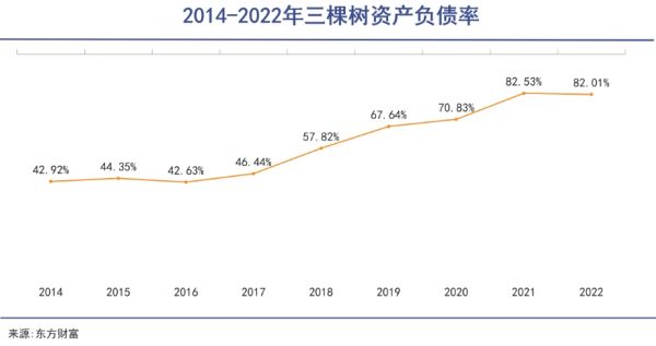 一方面钱收不回来,但另一方面债务的压力又越来越大:2014年,三棵树的资产负债率仅仅为42.92%;2022年,已飙升至82.0%;到2023年虽然稍有缓解,仍有79.98%。