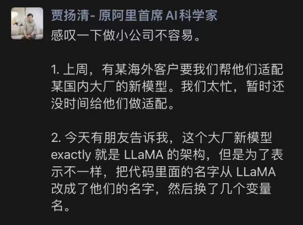 近期,今年3月份从阿里离职投身AI大模型创业的贾扬清爆料称,在帮助海外客户适配国内某一新模型中,被朋友告知该模型用的其实是LLaMA架构,仅在代码中更改了几个变量名。