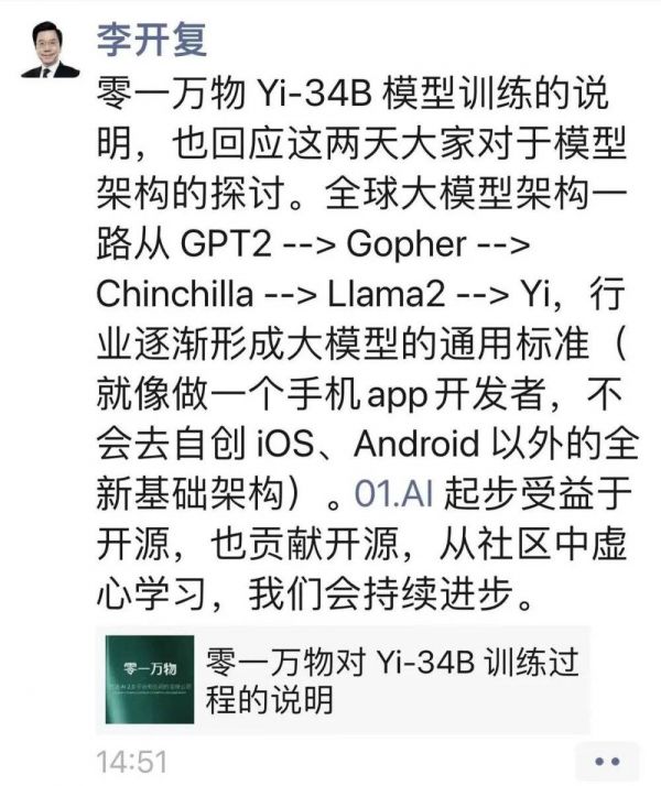 李开复AI公司回应大模型抄袭:尊重开源社区的反馈,将更新代码