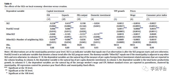 经过比较前几轮和后几轮建立经济特区的城市之间的变化,研究发现,经济特区计划不仅通过企业迁移增加了外国直接投资,而且没有挤出国内投资,虽然经济特区存在转移效应,即转移周边城市的投资到特区当中,但转移效应幅度显著小于创造效应。
