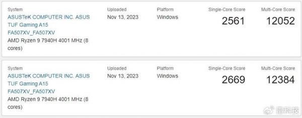 作为对比,我们再来看看AMD的PC处理器分数,AMD目前的旗舰型号为Ryzen9 7940H,单核性能约2500分,多核性能约为12000分,从数据上看,在多核性能上要略输于酷睿Ultra 7 155H,单核性能则略微超过。