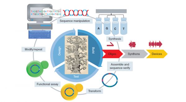 科学家会先使用计算机软件辅助设计要合成的DNA构建。设计的DNA将被分为1~1.5kb的可合成片段(synthons)。合成片段可以通过单链寡核苷酸进行组装拼接合成,组装成更大的DNA元件。组装好的DNA需要进行两步验证:序列验证和将其转化到细胞后的功能验证。根据验证结果,进行修改,重复测试循环,直到获得所需要功能的DNA构建体[3]。