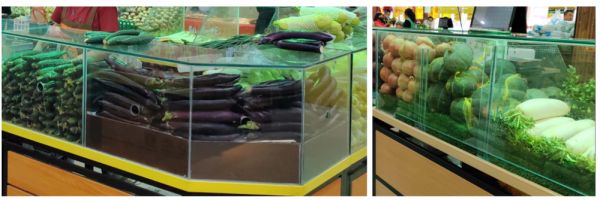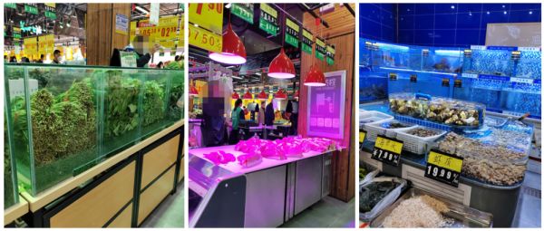 对于灯光的使用,一般菜用绿色、畜肉用红色、水产用蓝色,以凸显商品新鲜。笔者发现,有些档口有色灯光使用的极其夸张。