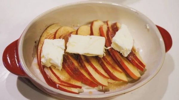 这道食谱的准备工序如下:将苹果切成两半,但不要切得太深,以免穿透底部。然后挖掉苹果的中心,加入以1:9比例混合的肉桂粉和砂糖,将肉桂糖填满苹果洞,最后在顶端放上黄油。