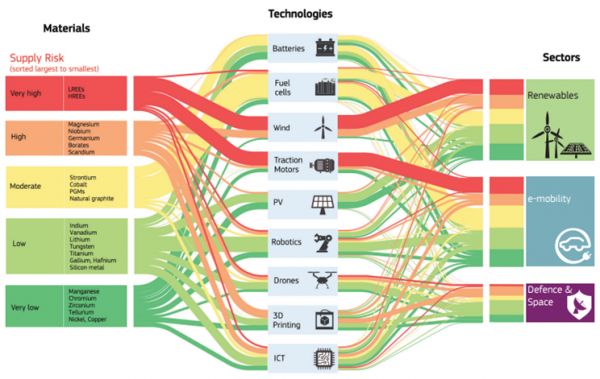 图说:九种选定技术和三个部门的原材料流向及其目前的供应风险的半定量表述,来源:欧盟委员会