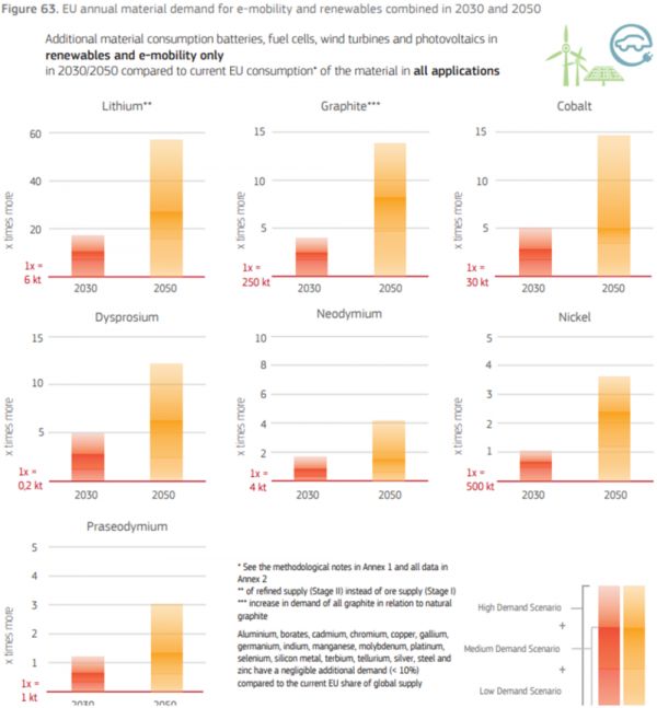 图说:2030 年和 2050 年欧盟电动汽车和可再生能源的关键原材料年需求量总和,来源:欧盟委员会