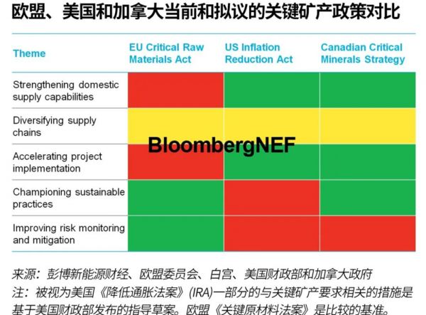 图说:欧盟、美国和加拿大当前拟议的关键矿产政策对比,来源:BNEF