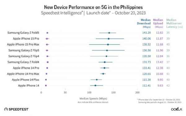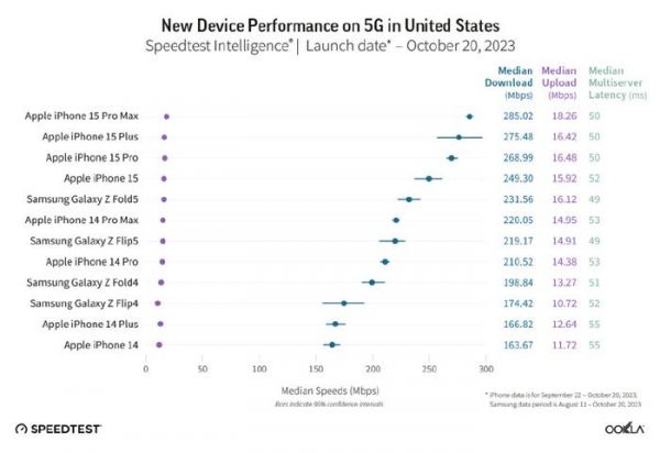 Ookla的报告收集了9月至10月期间的iPhone 15系列的数据(三星手机的数据为8月至10月),并以中位数下载速度作为评判标准。报告显示,iPhone 15 Pro Max或者在某些情况下是iPhone 15或15 Plus,都是最快的5G手机,而且领先幅度很大。