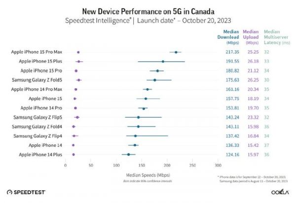 在加拿大,iPhone 15 Pro Max的5G下载速度为217.35 Mbps,也是最快的。iPhone 15 Plus和15 Pro分别排在第二和第三位,三星Galaxy Z Fold5排在第四位,其5G下载速度为175.63 Mbps。