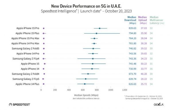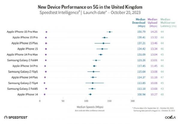 在英国,iPhone 15系列手机也占据了前五名的位置,三星Galaxy Z Fold5排在第六位,其5G下载速度比iPhone 15系列低了20-30 Mbps。