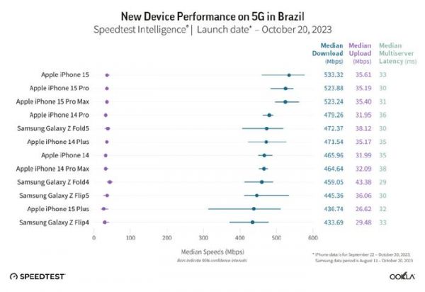 比较有趣的是,iPhone 15在巴西的5G下载速度竟然超过了iPhone 15 Pro和Pro Max,达到了533.32 Mbps。不过iPhone 15 Pro和Pro Max的5G下载速度也很接近,都在523 Mbps左右。