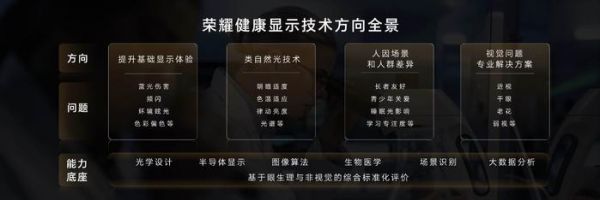 荣耀构建健康显示技术方向全景,将基于眼生理与非视觉的综合标准化评价,整合光学设计、半导体显示、图像算法、生物医学、场景识别、大数据分析等基础技术,在基础显示体验、类自然光技术、人因场景和人群差异、视觉问题专业解决方案四大方向持续探索。