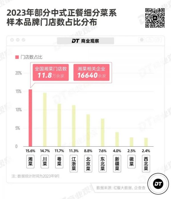 红餐大数据的统计结果显示,截至2023年9月,全国湘菜门店数达到正餐门店总数的15.6%,超过了川菜14.7%的门店数占比。