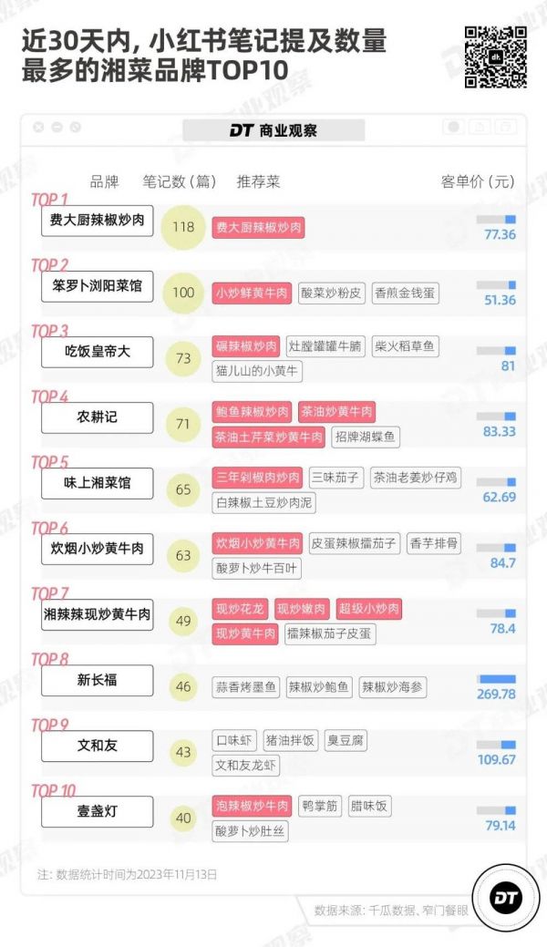 通过千瓜数据,截至2023年11月13日,近一个月内,小红书笔记提及数量最多的湘菜品牌TOP10中,除了新长福走的是中高端路线,其余品牌客单价基本在60~80元之间。