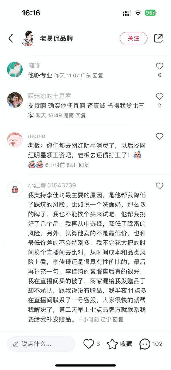 有的消费者则是想省心省事“降低决策成本”。电商平台越来越多,商品越来越多,在物质供给高度繁荣的今天,消费者的筛选成本在增加,直播间可以帮助消费者做减法。比如一名小红书用户就直言,她支持李佳琦最主要的原因,就是“他帮我降低了踩坑的风险。比如说一个洗面奶,那么多的牌子,我也不能挨个买来试吧,他帮我挑好了几个品,我再从中选择,降低了踩雷的风险。另外,就算他卖的不是最低价,也和最低价差的不会特别多,我不会花大把的时间挨个直播间去比对。”