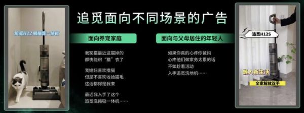 对应到具体的场景上,则是让商品针对不同的人群去做不同的营销。譬如追觅旗下的洗地机,面对养宠家庭做清理猫毛的广告,面对与父母居住的年轻人,做孝顺父母的广告。以及针对不同的需求去投放不同的内容。