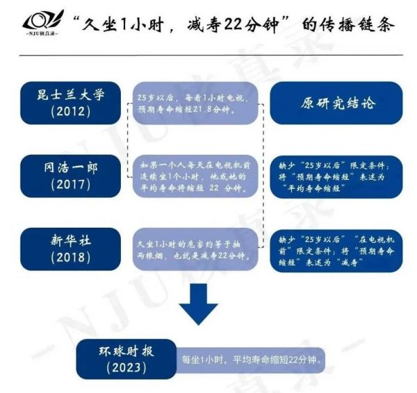 2018年12月,新华社在微信推文[8]中提到,“澳大利亚一项研究发现,久坐1小时的危害约等于抽两根烟,也就是减寿22分钟。”结合“澳大利亚研究”“抽两根烟”等表述,基本可以确定其结论源自上文提到的2012年澳大利亚昆士兰大学关于电视观看时长与死亡率关系的这份研究。但在推文中,“25周岁以上”“看电视”等限定条件并未说明。