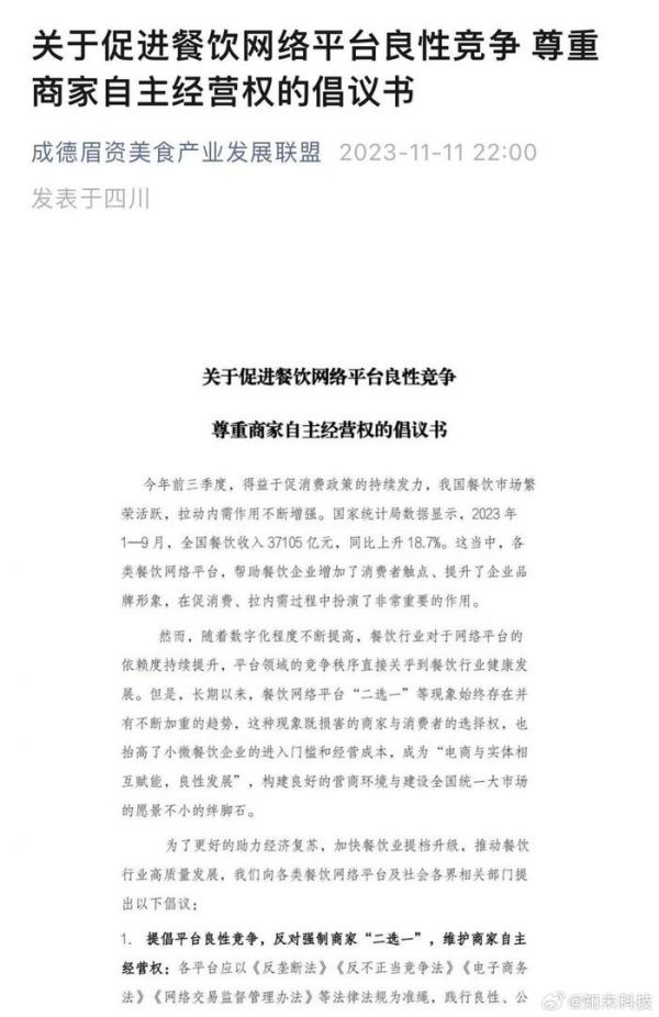 对于这种强制要求商家“二选一”的行为,近日,成德眉资美食产业发展联盟共50多个行业商协会,发布了《关于促进餐饮网络平台良性竞争、尊重商家自主经营权的倡议书》。文中提到,倡导平台之间的良性竞争,呼吁各平台共同遵守相关法律法规,尊重商家和消费者的权益,保障商家的自主定价权等内容。