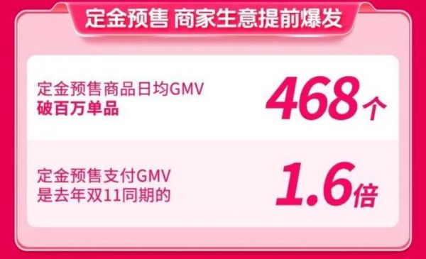 事实证明这次双11做好了预售抢跑的商家生意增长更好。数据显示,在抖音商城双11好物节期间,定金预售商品日均GMV(商品交易总额:包含拍下未支付订单金额)破百万的单品达468个,其中定金预售商品的整体支付GMV是去年双11的1.6倍。