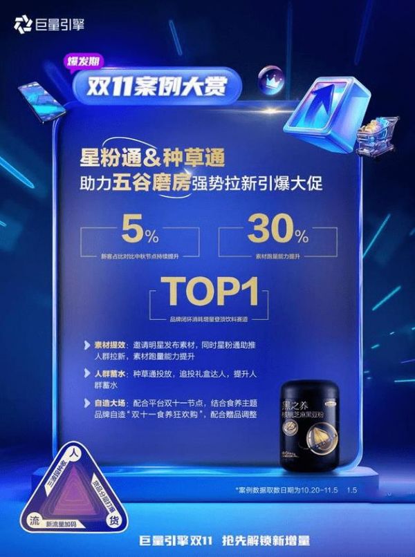 比如五谷磨房邀请明星合作发布独特的内容素材,在此过程中,借助星粉通工具进行加持,加强人群拉新和素材跑量的效果。除此之外,通过种草通的运用,进一步提升人群蓄水的效果。最后结合平台双11节点,自造“双11食养狂欢购”,并通过直播间产品降价等方式吸引用户关注和购买,实现双11品牌消耗增量登顶饮料赛道TOP1。