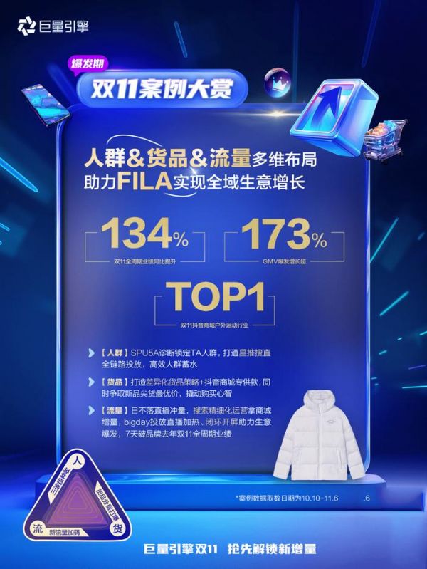 比如FILA,通过巨量引擎SPU5A工具,在今年的双11活动中锁定TA人群,并通过星推搜直链路实现高效人群蓄水;通过差异化货品策略打造抖音商城专供款吸引用户关注,新品尖货最优价撬动用户购买心智;在流量方面,日不落直播冲量+搜索精细化运营拿商城增量,并在big-day投放直播加热、闭环开屏等,最终用7天时间,做到去年双11全周期的业绩。