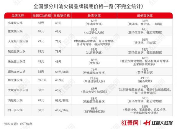 通过对比多家川渝火锅品牌菜单价目表,红餐网发现68元的锅底价格在目前的川渝火锅市场还是较为常见。但依据消费者需求选择不同,锅底价格呈现不一样的价格。除此以外,全国各地火锅底料价格差异较大。