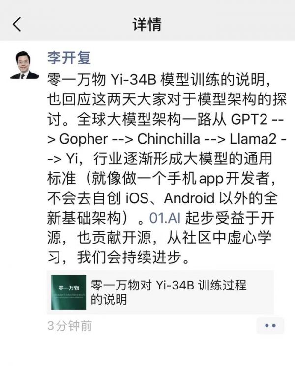 李开复在转发这则说明时,也在朋友圈表示,该内容是回应这两天大家对于模型架构的探讨。