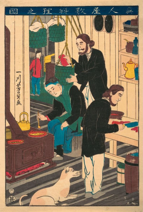 《在一家外国餐馆》,1860年,一川芳员,多色木版画。