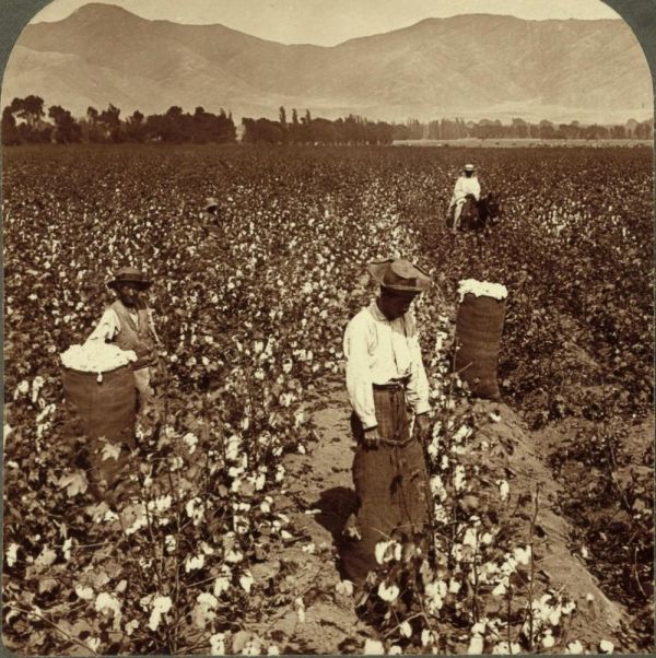 中国劳工在安第斯山脉脚下的灌溉田上采摘棉花,秘鲁维塔尔特,1900年,立体照片。