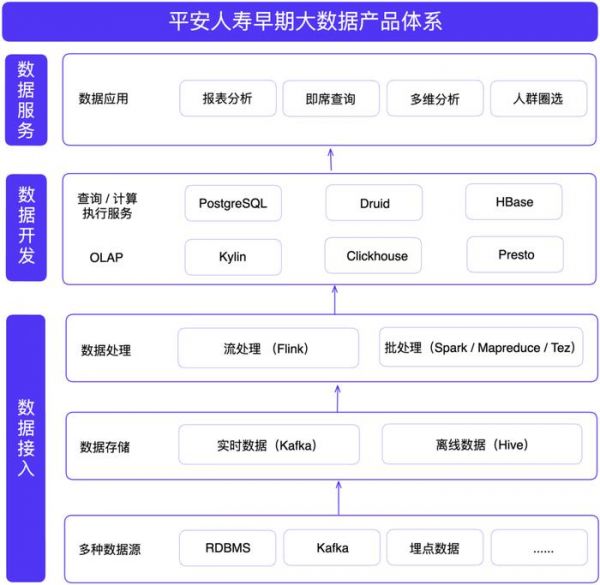 随着大数据时代的到来,传统数据库出现性能瓶颈,基于 Oracle 的数据仓库无法满足海量数据的存储、处理与应用需求,因此在 2016 年平安人寿引入了 Hadoop 建立寿险大数据平台。在近十年的大数据技术探索中,以提升数据质量、加快业务数据分析效率、加速数据价值变现为目标,平安人寿基于大数据平台构建了数据中台并引入数据治理体系,全方位保障业务用数效率、提升数据生产力。在数据应用层引入了多个开源大数据处理和分析组件,结合业务对于分析的实际需求开发了多个数据应用系统,为业务用户分析决策提供支持。