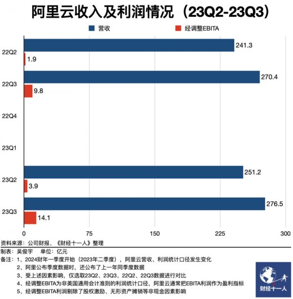 阿里集团2024财年二季度(即2023年三季度)财报显示,阿里云营收276.4亿元,同步增长2.3%。经调整EBITA利润(非美国通用会计准则下的利润统计口径,阿里云通常把EBITA利润作为盈利指标,该口径剔除了股权激励、无形资产摊销等非现金因素影响,被认为更能体现真实业绩)为14.09亿元。