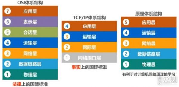 所谓的二层交换机、三层交换机,其“层”的定义来自计算机网络的体系结构OSI或TCP/IP标准。其中,OSI模型属于法律上的国际标准,共有如下7层结构(下图左),但事实上通用的国际标准为TCP/IP的4层结构模型(下图中),二者区别在于后者少了会话层和表示层,同时把数据链路层和物理层合并成为“网络接口层”这一层。