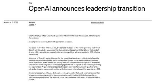Altman 先生的离职是在董事会的审议性审查过程后作出的,该过程得出结论,他与董事会的沟通不一贯坦诚,妨碍了其行使职责的能力。董事会对他继续领导 OpenAI 的能力不再有信心。