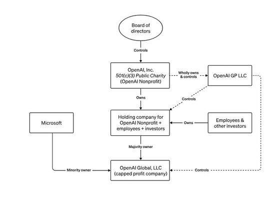 据悉,董事会的大多数成员是独立的,独立董事不持有 OpenAI 的股权,OpenAI 的营利性子公司 OpenAI Global 从 2019 年成立的有限合伙企业 OpenAI LP 转型而来,该公司是在非营利组织 OpenAI 成立大约三年后注册的,并且“完全”由 OpenAI(在特拉华州注册)控制”,虽然 OpenAI Global 被“允许寻求和分配利润”,但它受到非营利使命的约束。