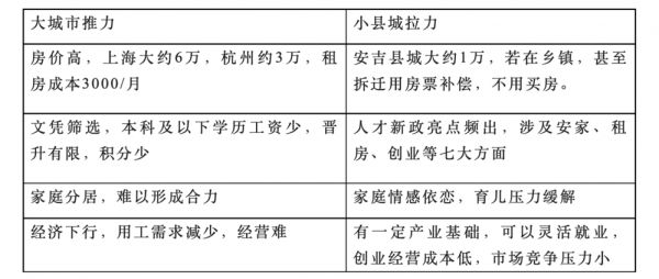 如:又木,女,31岁,自己原来在上海房地产公司工作,2017年回家结婚,工作也换到安吉的房地产项目,老公在政府单位上班,难以流动。两个人在上海买房压力很大,而回到安吉。在本地没有住房压力,本地年轻人很多,都比较习惯这个节奏。