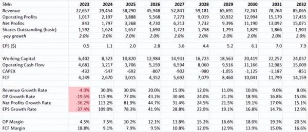 在贴现现金流(“DCF”)模型中,2023 财年的假设与公司的指导一致。预计 MI300 出货量和增长将推动强劲增长,我预计未来几年将出现强劲的上升轨迹。随着企业越来越多地将工作流程转移到云端并将机器学习集成到其运营中,对 GPU 加速器的需求即将激增。因此,我假设 2024 财年和 25 财年的收入增长 30%,2032 财年逐渐降至 8%。根据这些增长预测,该模型在 2023 财年至 2032 财年期间的平均收入增长率为 14%。