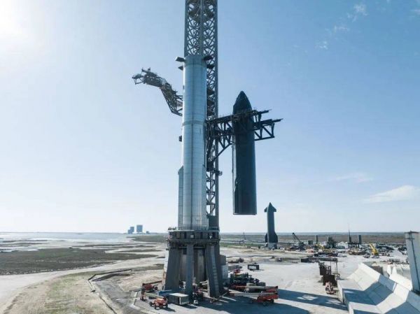 图注:发射准备期间,星舰被吊装到火箭上方。