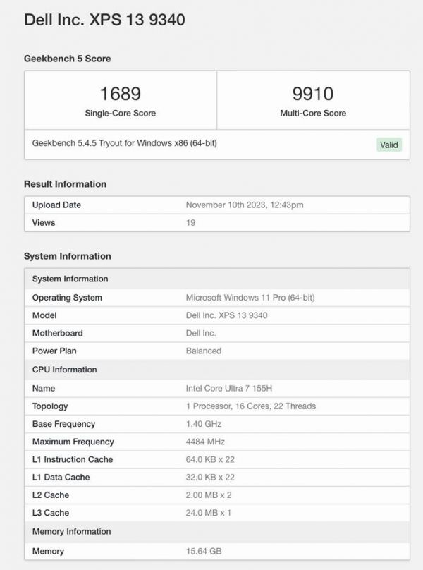 IT之家 11 月 18 日消息,戴尔新款 XPS 13 笔记本现已出现在了 Geekbench 上,搭载英特尔新款 Ultra 7 155H 处理器。