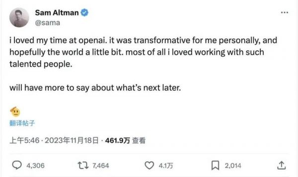11月18日凌晨5:46,奥特曼在X平台发信息回应:“我热爱在OpenAI的这段时光,它改变了我,也希望它能改变世界。最重要的是我曾和众多才华横溢的人一起工作。关于下一步的打算,我晚些会有更多解释。”