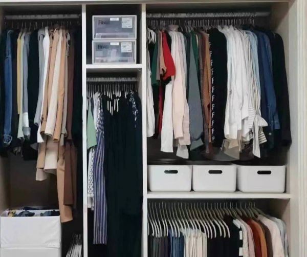 改造完成后,我们先把她家所有的衣服都清空,筛选出一批需要“断舍离”的物品,再把剩下的衣物重新分类,上架悬挂。这时候有的客户会希望按照季节,或按颜色、按长短分类悬挂,整理师也会按照客户的要求和实际情况给出收纳建议,最后贴上标签,完成清洁收尾工作。