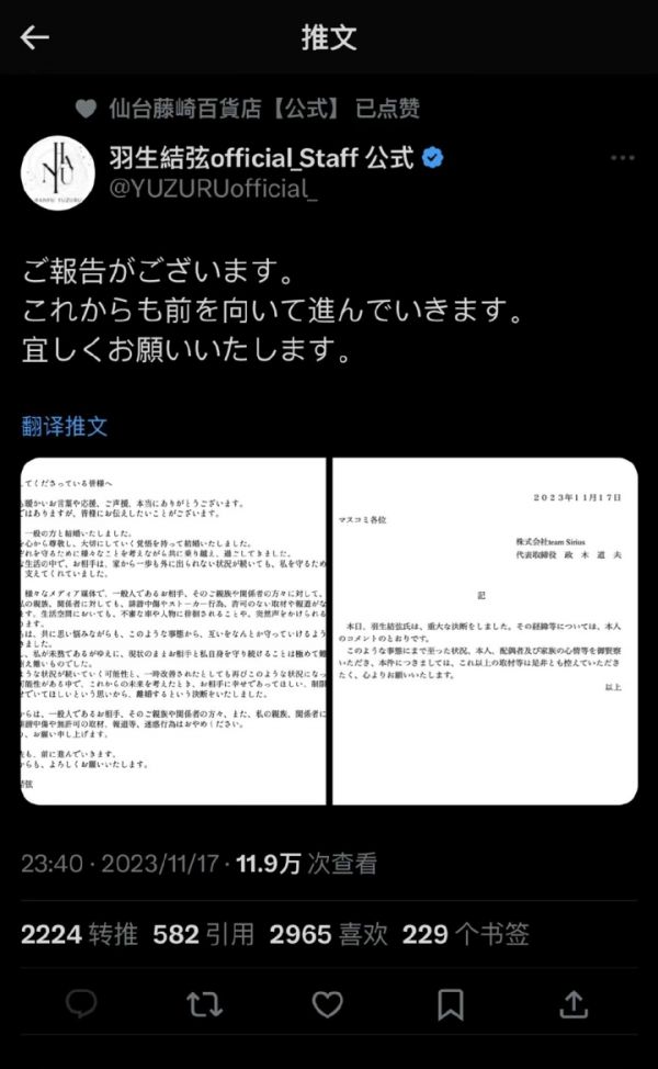 11月17日晚,羽生结弦在他个人官方X主页“羽生结弦official_Staff公式”上公布了自己离婚的消息。