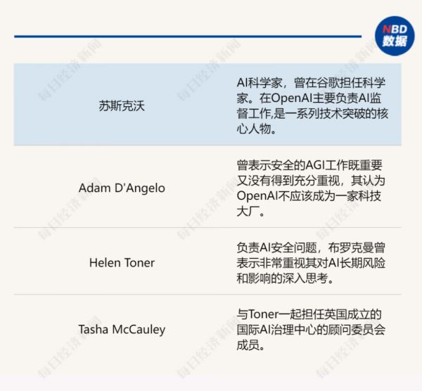 OpenAI原本的董事会成员包括阿尔特曼、布洛克曼、苏斯克沃、Quora首席执行官Adam D’Angelo、技术企业家Tasha McCauley以及乔治城大学安全与新兴技术中心的Helen Toner。也就是说,后4位成员投票作出了罢免的决定。